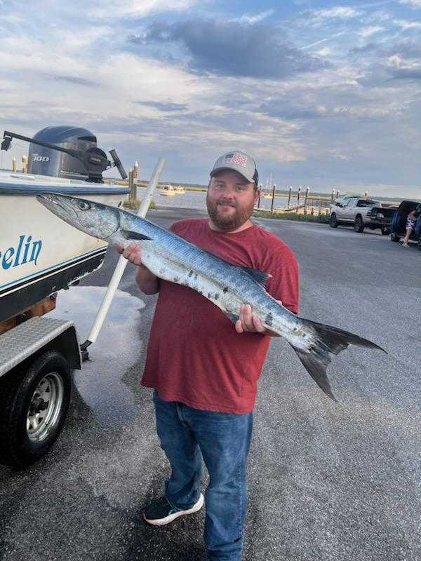 Great Barracuda: With their menacing teeth and lightning-fast strikes, barracuda are the wolves of our coastal waters. They can reach lengths of 5 feet or more and are often found patrolling near the surface around reefs and wrecks. Barracuda are ambush predators, known for their blistering runs and acrobatic leaps when hooked. We often catch them while trolling or casting topwater lures. They're present year-round but seem most active in the warmer months. While not typically kept for eating, barracuda offer an exciting catch-and-release opportunity, especially for kids who get a kick out of their fierce appearance.